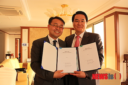 【인천=뉴시스】김경목 기자 = 강원 동해시 망상해변에 워터파크 시설을 갖춘 사계절 체류형 복합 휴양리조트가 건립된다. 인천 골드스카이 호텔앤리조트 김창환(오른쪽) 대표와 국제해양개발 주식회사 양세열 대표가 지난달 25일 골든스카이 호텔에서 가칭 '망상 해오름 리조트' 공동 사업 계약을 체결하고 포즈를 취하고 있다. (사진=골드스카이 호텔앤리조트 제공)