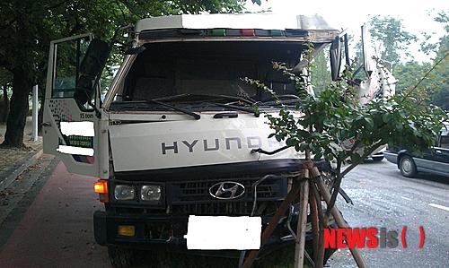 【창원=뉴시스】강승우 기자 = 9일 오전 7시34분께 경남 창원시 의창구 팔용동 창원대로 홈플러스 방면에서 오모(45)씨가 몰던 15t 화물트럭이 출근길 버스를 들이받는 사고가 발생했다. (사진= 창원소방본부 제공)