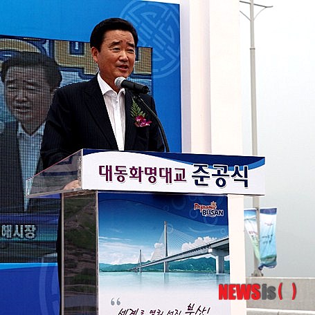 【김해=뉴시스】김상우 기자 = 9일 부산시 화명동과 김해시 대동면을 연결하는 '대동화명대교'가 개통됐다. 낙동강을 가로 질러 부산과 김해를 잇는 초정∼화명간 광역도로 3.55㎞ 중 안막IC∼화명간(대교구간) 1.544㎞가 이날 준공식을 갖고 김맹곤 김해시장이 개통을 축하하고 있다.