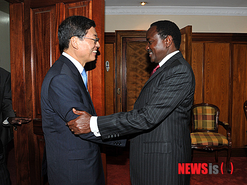 【서울=뉴시스】박주성 기자 = 아프리카 2개국을 순방 중인 김황식 국무총리가 9일(현지시각) 첫 방문국인 케냐에서 칼론조 무쇼카 케냐 부통령과 인사를 나누고 있다. (사진=국무총리실 제공)