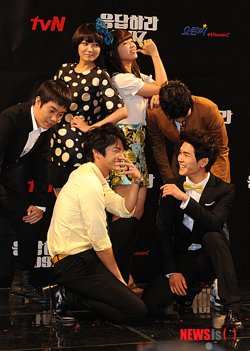 【서울=뉴시스】김영욱 기자 = 12일 오후 서울 강남구 CGV 청담씨네시티 엠큐브(M CUBE)에서 열린 tvN 세 주간드라마 '응답하라 1997' 제작발표회에서 출연배우들이 90년대 아이돌의 포즈를 취하고 있다. 왼쪽부터 시계방향으로 은지원, 신소율, 정은지, 이시언, 호야, 서인국.