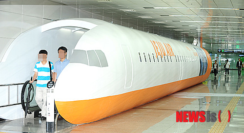 【서울=뉴시스】김기태 기자 = 16일 오후 제주항공은 서울 강남구 지하철 강남역 2호선과 신분당선을 연결하는 환승통로의 무빙워크에 국내 최초로 길이 25m, 높이 3m 크기의 항공기 모형을 설치해 제주항공을 체험하는 새로운 형태의 광고를 진행하고 있다.