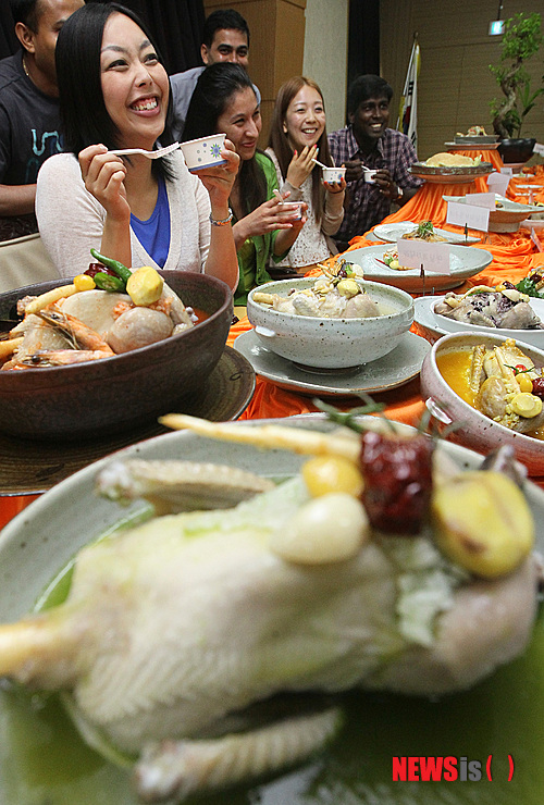 【수원=뉴시스】강종민 기자 = 17일 경기 수원 농촌진흥청 국립축산과학원에서 열린 국가별 입맛에 맞춘 우리맛닭 삼계탕 요리 전시회에서 외국인들이 삼계탕을 맛보고 있다. 농진청 축산원은 여름보양식 삼계탕의 수출확대를 위해 미국, 일본, 중국 등 각 나라의 입맛에 맞는 삼계탕과 체중조절용 삼계탕 등 기능성 삼계탕 요리법을 개발했다.