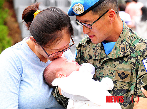 【인천=뉴시스】전신 기자 = 19일 오후 인천 국제평화지원단 연병장에서 열린 동명부대 11진 파병 환송식에서 강만석 상사가 가족들과 인사를 나누고 있다.