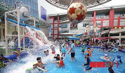 【서울=뉴시스】박주성 기자 = 용산 아이파크몰이 여름 방학과 휴가철을 맞아 22일 쇼핑몰 내에 워터파크를 개장했다. 4층 이벤트파크에 문을 연 워터파크에는 어린이 풀장과 워터 슬라이드, 파라솔 쉼터 등 물놀이 시설을 갖췄다. (사진=현대아이파크몰 제공)