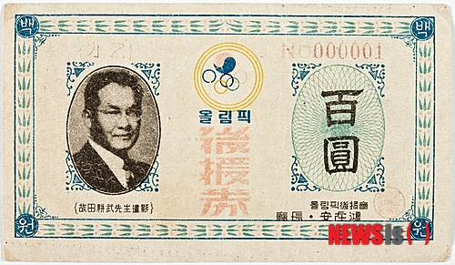전시회에서는 1936년 손기정 선수가 참가한 제11회 베를린올림픽에서부터 2012년 제30회 런던올림픽까지 우리나라 선수들의 올림픽 출전의 역사를 살펴볼 수 있도록 문서, 사진, 영상 등 170여 점의 기록물을 전시한다. 사진은 후원권 앞면, 제14회 런던올림픽 후원권 /1948. 런던올림픽 경비 마련을 위해 발행한 우리나라 최초 복권 (문화재청). (사진=국가기록원 제공)