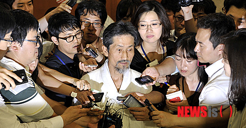 【서울=뉴시스】홍찬선 기자 = 통합진보당 의원총회에서 이석기·김재연 의원 제명안 처리가 부결 처리 된 가운데 강기갑 대표가 27일 서울 여의도 국회에서 기자회견을 마친 후 정론관을 나서며 기자들의 질문에 답하고 있다.