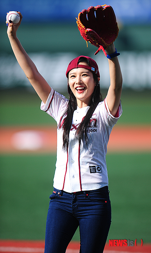 【서울=뉴시스】김인철 기자 = 29일 오후 서울 목동야구장에서 열린 2012 팔도 프로야구 넥센 히어로즈와 삼성 라이온즈의 경기에서 가수 써니힐의 맴버 승아가 시구에 앞서 관중들에게 인사를 하고 있다.