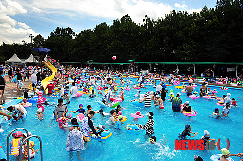 【안양=뉴시스】박문호 기자 = 서울 낮 기온이 35도까지 오르는 등 전국 대부분 지역에 폭염경보가 내려진 3일 오후 경기 안양시 동안구 비산동 안양종합운동장 실외수영장에서 많은 시민이 물놀이를 즐기고 있다.