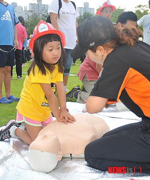 【서울=뉴시스】전진환 기자 = 동대문소방서(서장 김학준)는 18일 오전 동대문구청에서 시행하는 “구민 한마음 걷기의 날”에 동대문구민들을 대상으로 용두근린공원에서 CPR 체험교실 및 생활안전응급처치 ‘사랑의 119 이동 홍보단’을 운영 실시했다. (사진=동대문소방서 제공)