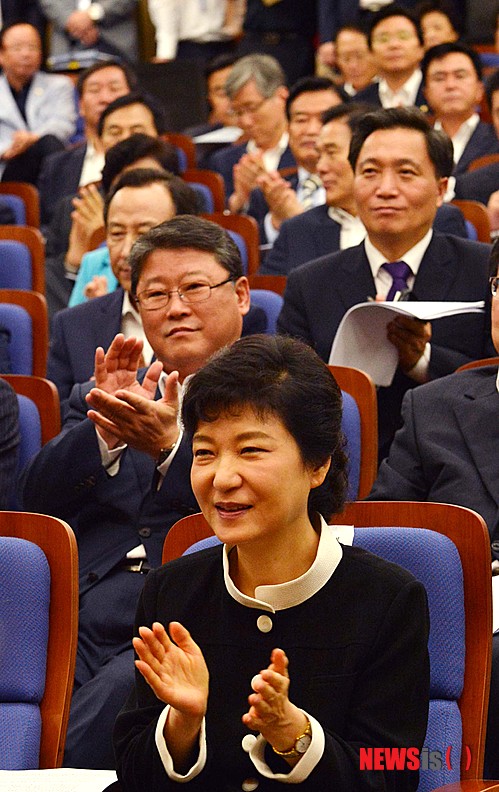 【서울=뉴시스】권주훈 기자 = 21일 오전 서울 여의도 국회 246호 회의실에서 열린 새누리당 의원총회에 참석한 박근혜 대통령 후보가 박수를 치고 있다.
