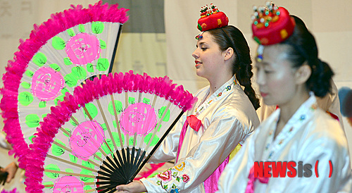 【서울=뉴시스】강진형 기자 = 27일 오후 서울 서초구 반포동 국립중앙도서관에서 열린 '세종학당 학습자 초청 한국문화 어울림 한마당'에서 세종학당 소속 외국인 학생들이 부채춤을 선보이고 있다.