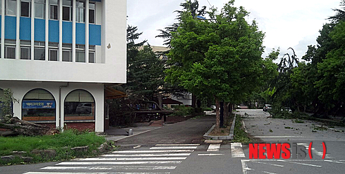 【전주=뉴시스】김운협 기자 = 제15호 태풍 '볼라벤'이 북상 중인 가운데 28일 오전 11시30분께 전북 전주시 덕진구 덕진동 전북대학교내 학생회관 인근의 조경수들이 꺾이거나 부러져 있다.