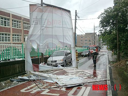 【대구=뉴시스】박광일 기자 = 28일 오전 제15호 태풍 볼라벤의 영향으로 대구 달성군 남리 북동초등학교 후문 앞에 인근 학원 간판이 떨어졌다. (사진=대구 달성소방서 제공)