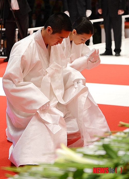 【가평=뉴시스】전진환 기자 = 6일 오전 경기도 가평군 설악면 송산리 청심평화월드센터에 마련된 문선명 통일교 총재 빈소에서 문형진 세계회장(왼쪽)과 부인인 이연아 목사가 절을 하고 있다. (사진=통일그룹 제공)