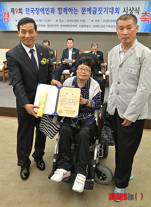 【서울=뉴시스】조종원 기자 = 13일 오후 서울 중구 한국프레스센터에서 열린 '9회 전국장애인과 함께하는 문예글짓기대회 시상식'에서 한국장애인유권자연맹 대상을 수상한 구애경씨가 최봉실 이사장과 함께 기념촬영을 하고 있다.