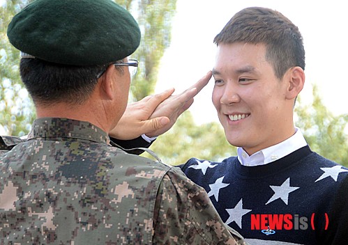 【논산=뉴시스】홍성후 기자 = 런던 올림픽 자유형 은메달리스트 박태환 선수가 4일 오후 충남 논산 육군훈련소에서 거수경례를 하자 군 관계자가 자세를 고쳐주고 있다.
