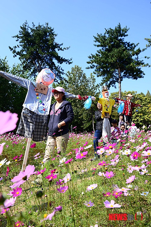 【서울=뉴시스】전신 기자 = 7일 서울 서초구 양재시민의 숲에서 진행된 허수아비 만들기 자원봉사 프로젝트에 참가한 가족들이 직접 만든 허수아비를 선보이고 있다. 제작된 허수아비는 옷장 속에서 잠자고 있는 모자, 옷, 스카프 등을 이용해 만들어졌으며 자매결연을 한 농촌마을에 기증된다.