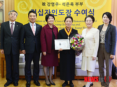 【서울=뉴시스】조수정 기자 = 12일 오전 서울 중구 대한적십자사에서 열린 故 강영우-석은옥 적십자 인도장 수여식에서 유중근 대한적십자사 총재(왼쪽)가 고 강영우 전 백악관 국가장애인위원회 정책차관보 부인 석은옥 여사에게 적십자 인도장을 수여한 뒤 기념촬영 하고 있다.
