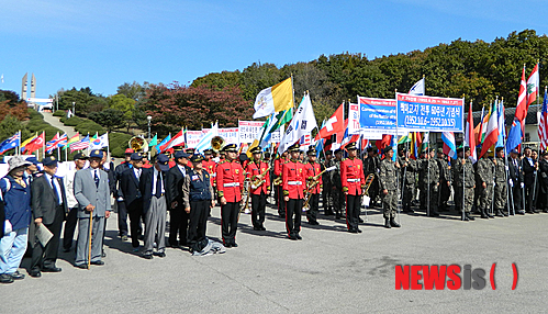 한편, (사)월드피스자유연합(대표 안재철)은 백마고지전투 60주년 기념 행사 일환으로 ‘생명의 항해 6.25전쟁 사진전’과 6.25전쟁 당시 대한민국을 지원한 세계 67개국에 대한 감사하는 국기 퍼레이드를 펼쳤다. 이 퍼레이드는 백마고지참전전우회 회원들과 육군 5사단, 9사단의 협조로 이루어졌다. (사진=월드피스자유연합 제공)