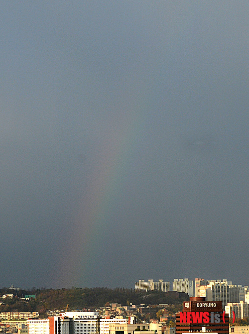 【서울=뉴시스】박주성 기자 = 전국적으로 가을비가 내린 11일 오후 비가 그친 충무로에서 바라본 서울 하늘에 무지개가 뜨고 있다.