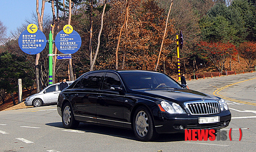 【용인=뉴시스】강종민 기자 = 故 이병철 삼성 창업주 25주기 추모식이 19일 오전 경기 용인 호암미술관 인근 선영에서 열린 가운데 추모식을 마친 이건희 회장의 마이바흐 차량이 선영을 빠져나오고 있다. 이날 추모식은 장남인 이맹희 CJ 전 회장과 3남인 이건희 삼성전자 회장의 상속 재산 분쟁으로 시간대를 달리 열렸다.