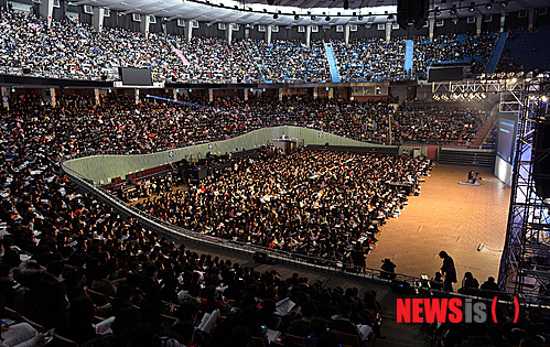 【서울=뉴시스】강진형 기자 = 2일 오후 서울 송파구 잠실실내체육관에서 열린 '대성학원, 2013 대입 최종지원전략 입시설명회'에 참가한 학부모 및 수험생들 대학입시전략 설명을 청취 하고 있다.