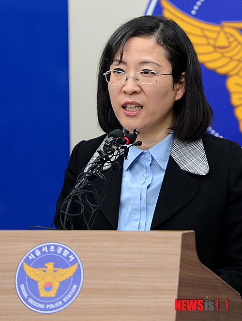 【서울=뉴시스】조수정 기자 = 14일 오후 서울 서초경찰서에서 임병숙 수사과장이 검사 성추문 피해여성 사진 유출 의심검사 관련 중간수사 내용을 발표하고 있다.