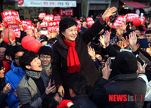 【군포=뉴시스】권주훈 기자 = 새누리당 박근혜 대선후보가 제18대 대통령선거 이틀을 앞둔 17일 오후 경기도 군포시 산본동 거리 유세에서 시민들을 향해 손을 흔들고 있다.