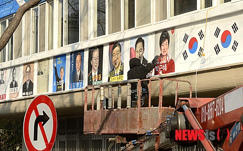【서울=뉴시스】박종민 기자 = 20일 오후 서울 종로구 선거관리위원회 연수원청사외벽 벽면에 벽화전문가가 박근혜 제18대 대통령 당선자의 포스터를 작화하고 있다. 선거연수원은 국민들로부터 공모한 선거와 관련된 그림, 만화, 시 등으로 청사외벽을 새롭게 단장하면서 한쪽 벽면에 역대 대통령 선거포스터를 작화했다.
