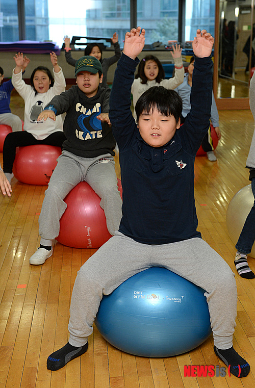 【서울=뉴시스】박종민 기자 = 겨울방학을 맞은 초등학생들이 27일 오전 서울 서초구 한전아트센터 내 양재 YMCA 에어로빅실에서 짐볼을 이용해 운동을 하고 있다. 서초구는 겨울방학을 맞이하여 경도비만이상 어린이들을 대상으로 '배 쏘~옥 키 쑤~욱 어린이 건강교실'을 운영한다.