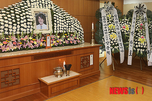 【서울=뉴시스】최동준 기자 = 고 최진실의 전 남편인 조성민 전 두산코치의 빈소가 마련된 6일 오후 서울 성북구 고려대 안암병원 장례식장에 92학번 대학동기인 박찬호 전 야구선수의 화한이 놓여 있다.