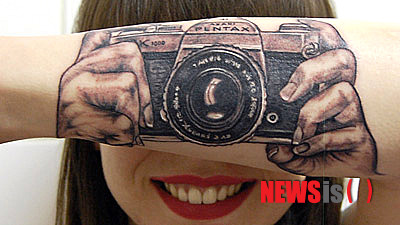 【서울=뉴시스】네덜란드의 한 여성 사진작가가 자신의 팔에 사진을 찍는 모습을 문신으로 새겨넣어 팔만 들어올리면 언제든 사진을 찍는 장면을 연출해낼 수 있게 됐다. <사진 출처 : 英 오렌지 뉴스 웹사이트>