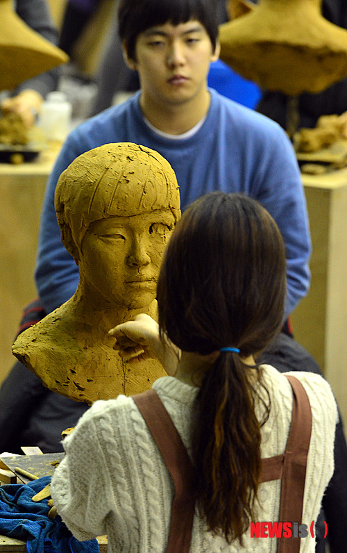 【서울=뉴시스】조종원 기자 = 29일 오후 서울 광진구 건국대사범대학부속고등학교 실내체육관에서 수험생들이 건국대학교 2013학년도 정시 신입생모집 일반학생전형 다군 예술디자인대학 현대미술전공의 '인체 두상 소조' 실기고사를 치르고 있다.