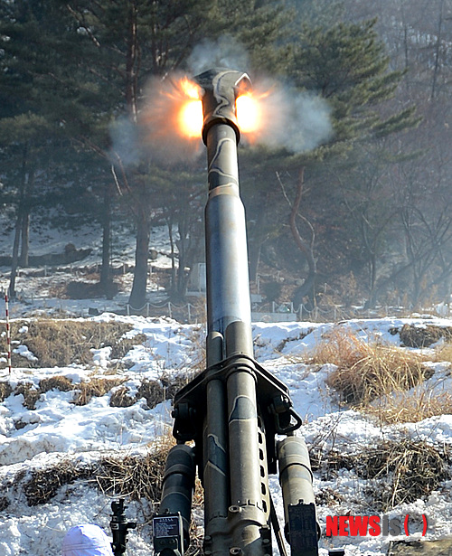 【철원=뉴시스】박종민 기자 = 15일 강원 철원군 포병훈련장에서 실시된 육군 화력전투준비태세 점검 사격훈련에 참가한 2포병여단 소속 155mm 견인포가 타격 목표를 향해 포탄을 발사하고 있다.