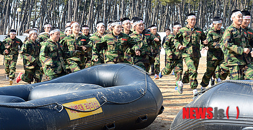 【태안=뉴시스】최동준 기자 = 대한레슬링협회 지도자 및 선수들이 14일 오후 충남 태안군 안면도 해병대 리더십 교육센터에서 '레슬링 IOC 올림픽 퇴출 반대 해병대 극기훈련'을 하고 있다.