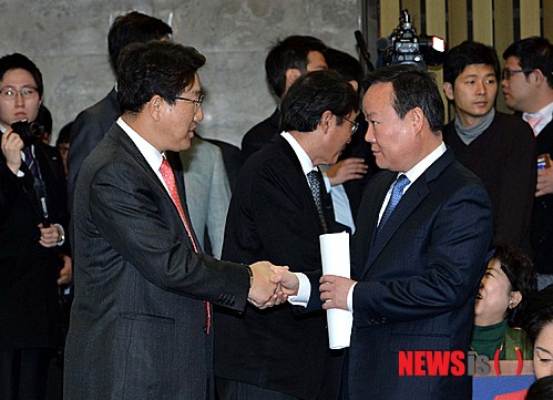 【서울=뉴시스】권주훈 기자 = 18일 오전 서울 여의도 국회 246호 회의실에서 열린 새누리당 의원총회에서 권성동의원과 김재원 의원이 인사를 나누고 있다.