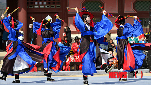 【서울=뉴시스】강진형 기자 = 24일 오후 서울 종로구 세종로 경복궁 흥례문 앞에서 조선시대 수문장 임명의식이 재현되고 있다.