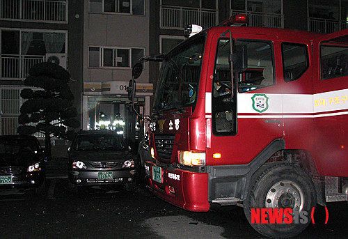 【목포=뉴시스】박상수 기자 = 6일 오후 11시21분께 불이난 전남 목포시 상동의 한 아파트 입구에 진압을 위해 소방차량이 출동해 있다. 이 날 불로 일가족 3명이 숨졌다.