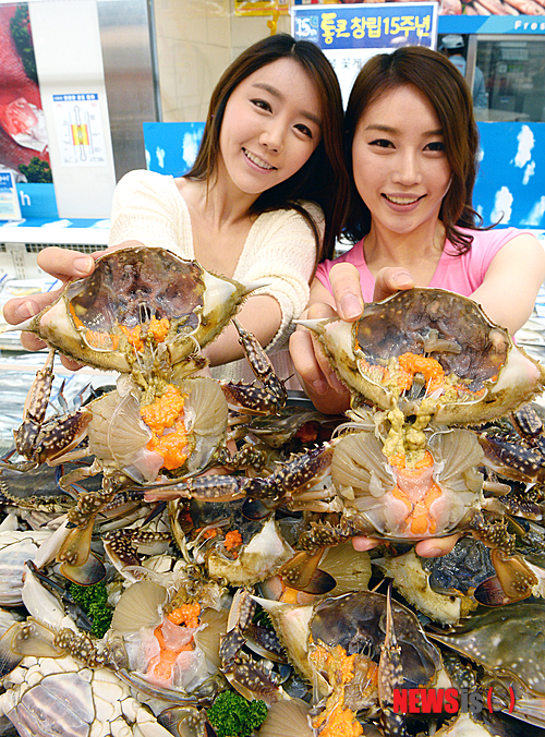 【서울=뉴시스】박주성 기자 = 9일 오전 서울 중구 봉래동 롯데마트 서울역점에서 산란기를 앞두고 밥 도둑으로 유명한 알이 꽉찬 봄철 암 꽃게를 11일 부터 17일까지 시세보다 35%가량 저렴한 100g당 2550원에 선보이고 있다.
