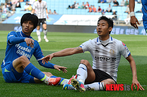 【울산=뉴시스】장지승 기자 = 28일 울산 문수축구장에서 열린 K리그 클래식 울산현대와 인천유나이티드의 경기에서 울산 한상운과 인천 이천수가 서로 상대 반칙에 의한 자기 공을 주장하고 있다. 울산과 인천은 2대 2로 비겼다.