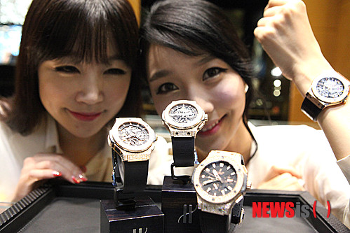 【서울=뉴시스】롯데백화점은 29일 서울 중구 에비뉴엘 위블로 매장에서 총 4억원 가량의 시계들을 선보였다. 이 중 가장 비싼 제품인 'Fall Pave Baget Diamond'는 1억 2천만원 가량이며 오른쪽 모델이 착용한 상품(Classic Fashion Ultra Thin King Gold)은 5천만원대에 판매하고 있다. (사진=롯데백화점 제공)