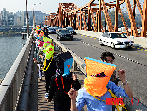 【서울=뉴시스】박종민 기자 = 4일 오후 서울문화재단 단원들이 게릴라댄스 퍼포먼스를 하며 서울 동호대교를 통과하고 있다.