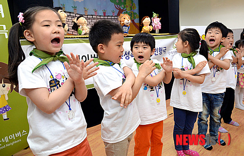 【서울=뉴시스】박동욱 기자 = 9일 오후 서울 서대문구 미근동 경찰청 어린이집에서 열린 '굿네이버스 아동성폭력예방 인형극'을 감상한 어린이들이 안돼요, 싫어요, 하지마세요 성폭력예방 구호를 외치고 있다.