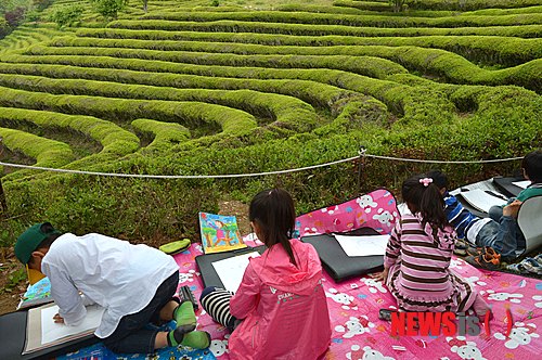 【보성=뉴시스】임영주 기자 = 녹차향기 가득한 계절의 여왕 5월에 전남 보성차밭 일원에서 제39회 보성다향제 녹차대축제가 열리고 있다. 16일 대한다업의 드넓은 녹차밭을 배경으로 학생들이 그림을 그리고 있다.