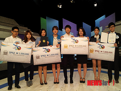 【서울=뉴시스】중앙선거방송토론위원회(위원장 이정희)는 지난 19일 서울 중구 JTBC 방송사 스튜디오에서 '선관위 창설 50주년 기념 대학생 토론대회'의 준결승전과 결승전을 진행하여 연세대학교 소속 경청팀(황귀빈,김경애)이 영예의 대상(장학금 7백만 원)을 차지했다고 밝혔다.