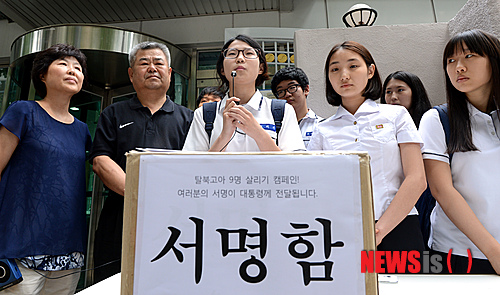 【서울=뉴시스】박상훈 기자 = 북한인권시민연합이 23일 오후 정부서울청사 후문에서 '탈북고아 살리기와 강제북송반대 국민서명 전달 기자회견을 연 가운데 서명운동을 주도한 고등학생들이 발언하고 있다. 2013.06.23.