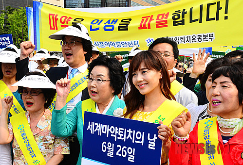 【서울=뉴시스】박문호 기자 = 세계마약퇴치의 날인 26일 오후 서울 종로구 세종로 광화문 광장에서 의약품 안전 홍보대사인 방송인 유진(오른쪽 두번째)과 한국마약퇴치운동본부 회원들이 가두 캠페인을 하고 있다. 2013.06.26.