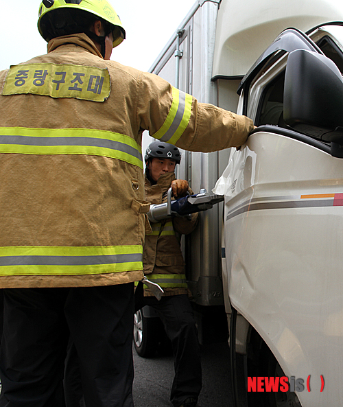 【서울=뉴시스】중랑소방서(서장 성재만) 119구조대는 1일 13시40께 서울 중랑구 묵동 리본타워 앞 도로에서 버스와 1톤 탑차의 추돌 사고로 차량에 갇힌 요구조자 1명을 유압전개기를 이용해 차량문을 개방, 구조했다. 2013.07.01. (사진=중랑소방서 제공)