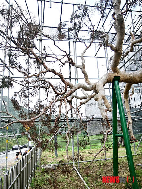 【괴산=뉴시스】강신욱 기자 = 지난 21일 충북 괴산군 청천면 삼송2리 천연기념물 290호 왕소나무가 지난해 8월 강풍에 쓰러진 뒤로 지지대에 의지해 생존의 위한 사투를 벌이고 있다. 2013.07.22.